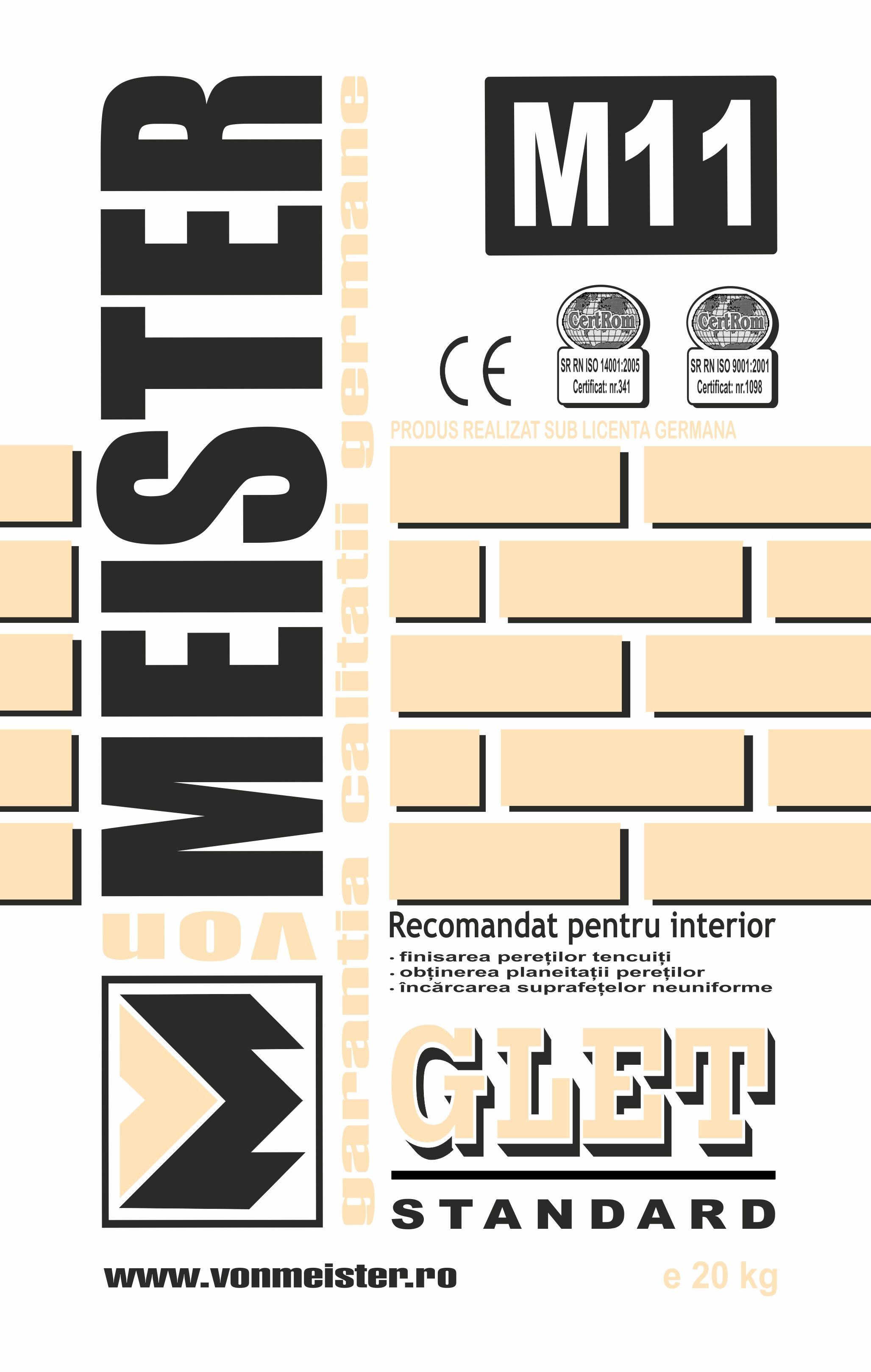 Gletul STANDARD M11 este un glet pe baza de ipsos tip EN 13279-1:2009 (C6/20/2), special aditivat, recomandat ca prim strat sau ca material de încarcare la finisarea suprafetelor interioare din: beton, beton usor, placi din gips-carton, tencuieli uscate pe baza de ciment sau ipsos.